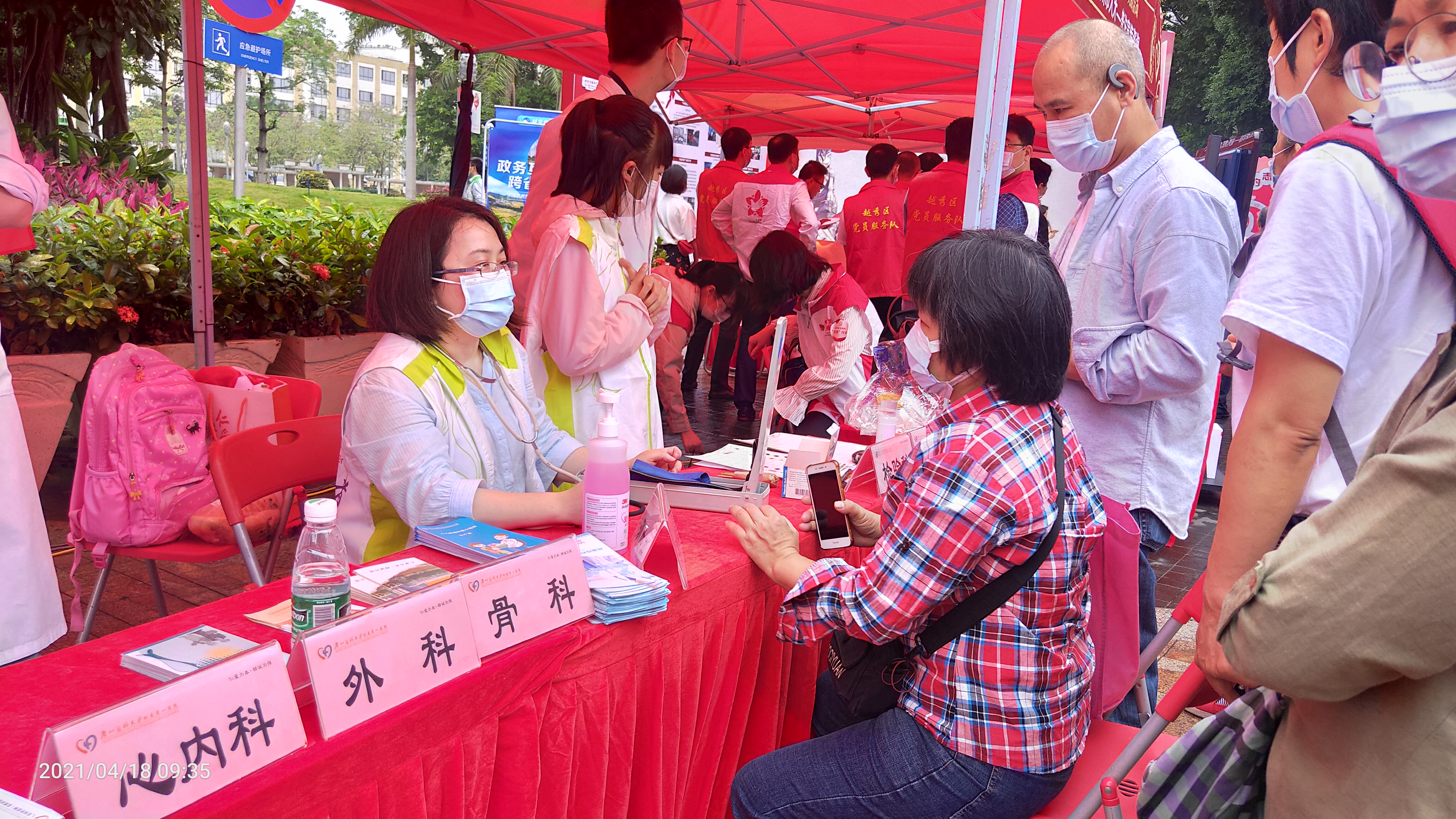 4月18日,南山志愿服务队在海珠广场开展志愿服务,为上百名群众提供疫苗接种咨询、消化内科、心内科、外科、骨科、血压血脂测量等健康咨询服务。