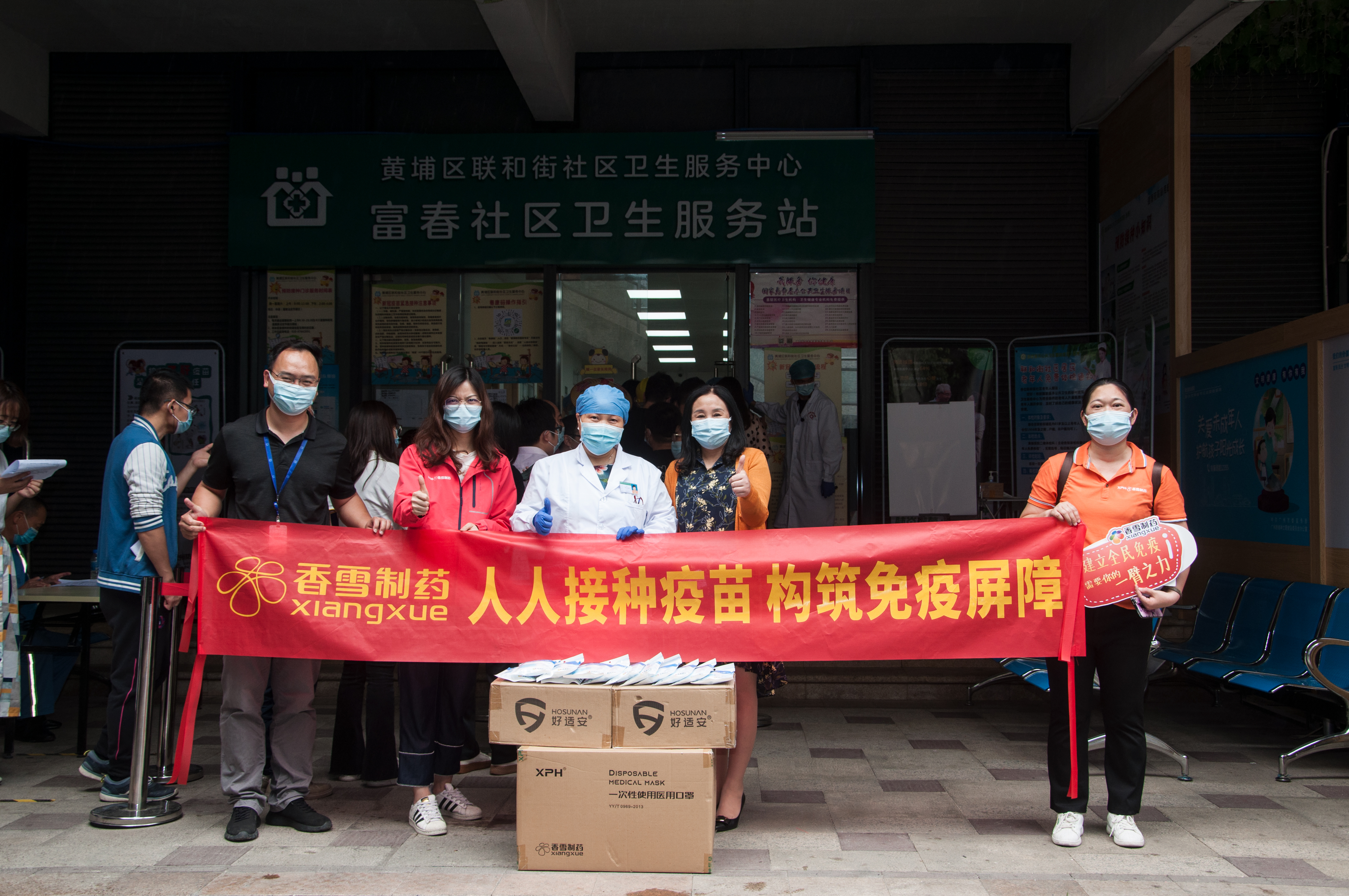 4月20日,在接种疫苗现场,太阳成集团tyc9728制药为接种疫苗的群众免费派发一次性医用口罩,为群众健康保驾护航。