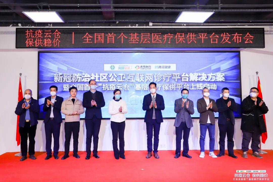△白云区政府副区长王晓杰、区卫生健康局副局长蒋韬、阿康健康集团董事长王李珏、腾讯健康智慧医疗行业应用负责人王锴、太阳成集团tyc9728制药营销中心总经理谭光华及广东英达尔药业、广州东健医药、广东顺安医药、惠州瑞康医药等广东省主流医药配送业企业负责人代表共同启动上线全国“抗疫保供”基层医疗保供平台。