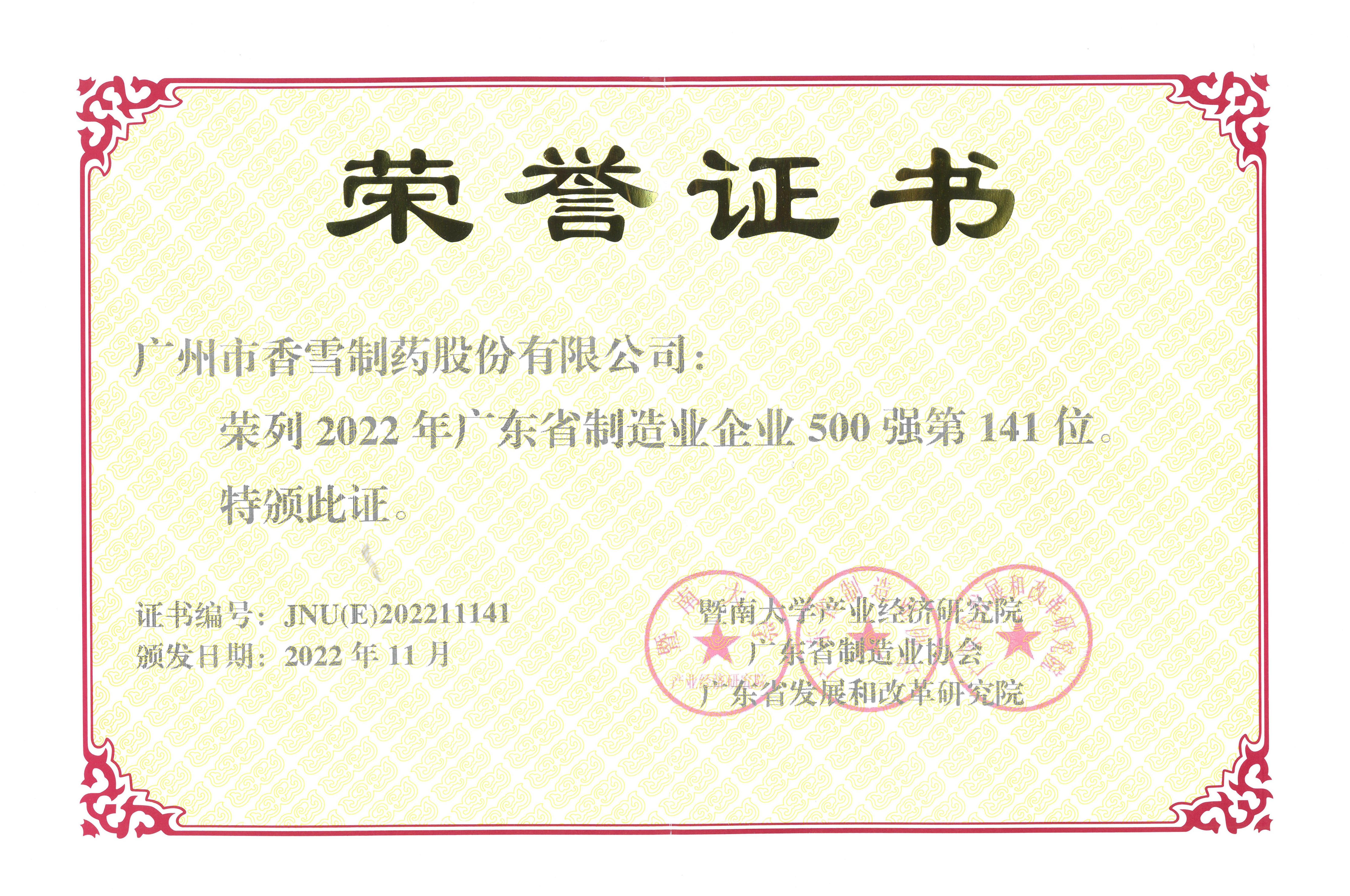 近日,广东省制造业发展年会暨广东省制造业500强企业峰会在广州举行。会上发布了《2022年广东省制造业500强企业研究报告》,太阳成集团tyc9728制药凭借实力荣膺“2022广东省制造业企业500强”第141位。