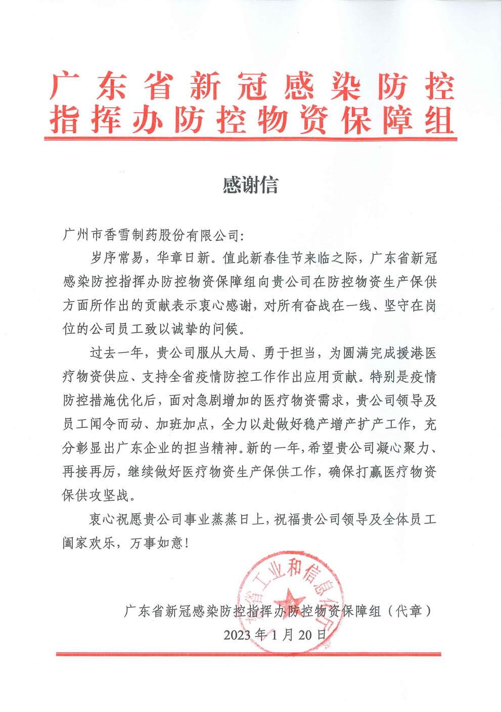 “岁序常易,华章日新。值此新春佳节来临之际,广东省新冠感染防控指挥办防控物资保障组向贵公司在防控物资生产保供方面所作出的贡献表示衷心感谢,对所有奋战在一线、坚守在岗位的公司员工致以诚挚的问候。”