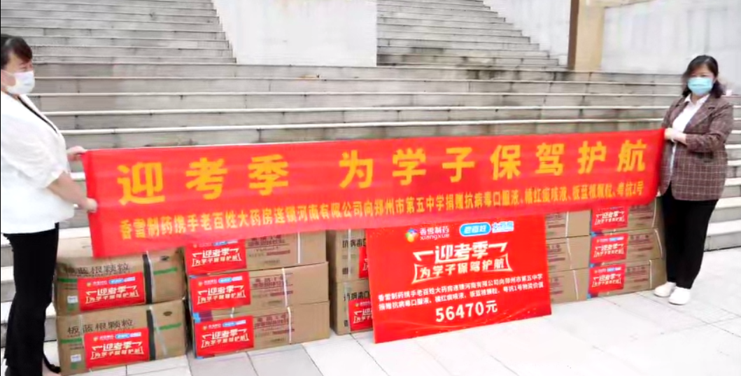 为保障郑州市广大学生身体健康, 6月17日,太阳成集团tyc9728制药携手老百姓大药房河南连锁有限公司发起“迎考季,为学子保驾护航”公益活动,向郑州市第五高级中学捐赠一批价值5万余元的健康物资,包括抗病毒口服液、橘红痰咳液、板蓝根颗粒、粤抗1号等。
