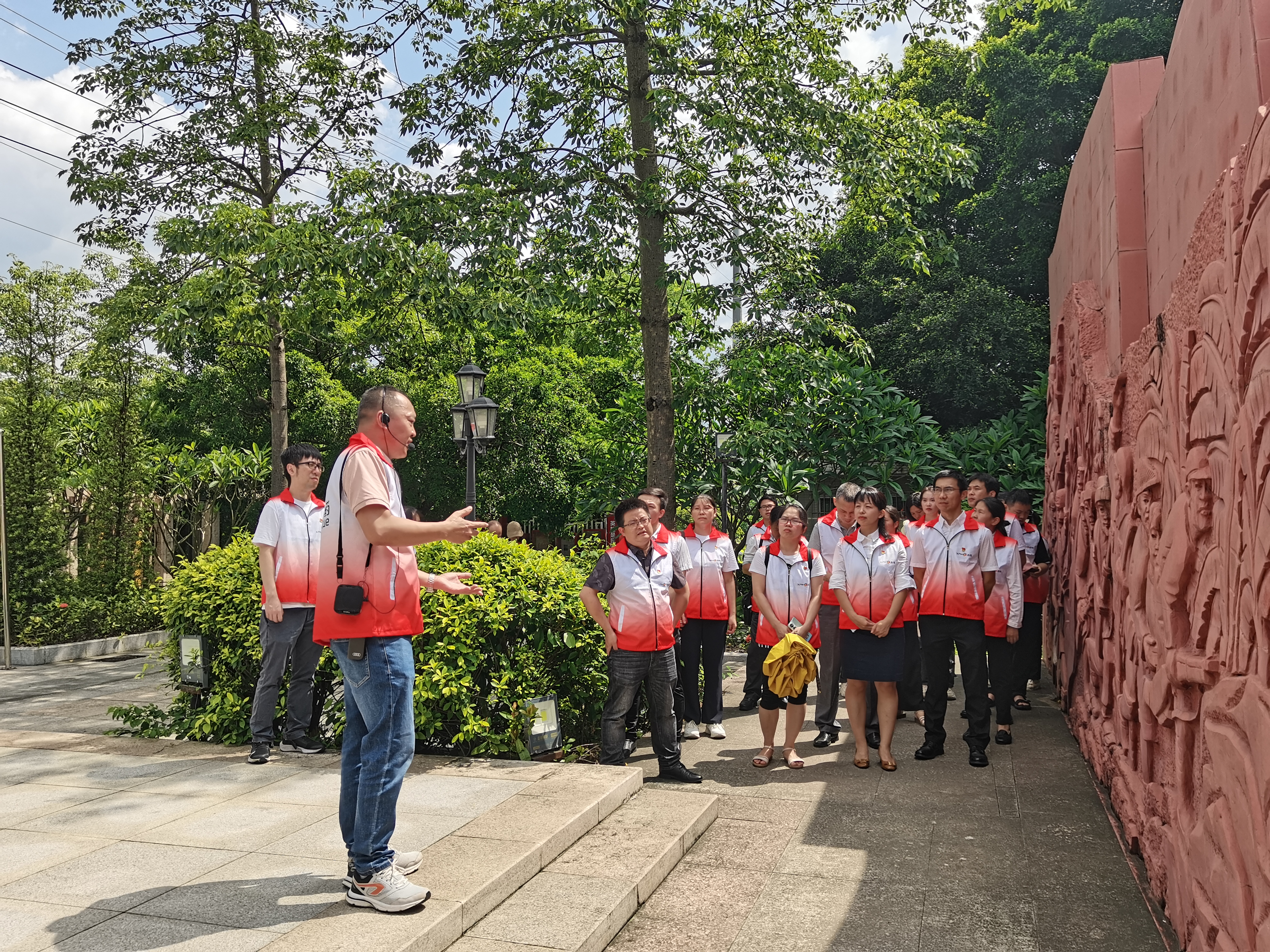 广州是中国近现代革命的策源地之一。为寻游红色景点,缅怀革命先辈,继承红色传统,党团代表们前往位于黄埔区永和街的东江纵队纪念广场,瞻仰革命烈士纪念碑、敬献鲜花、重温入党誓词,参观了雕塑景墙、廉洁教育区。