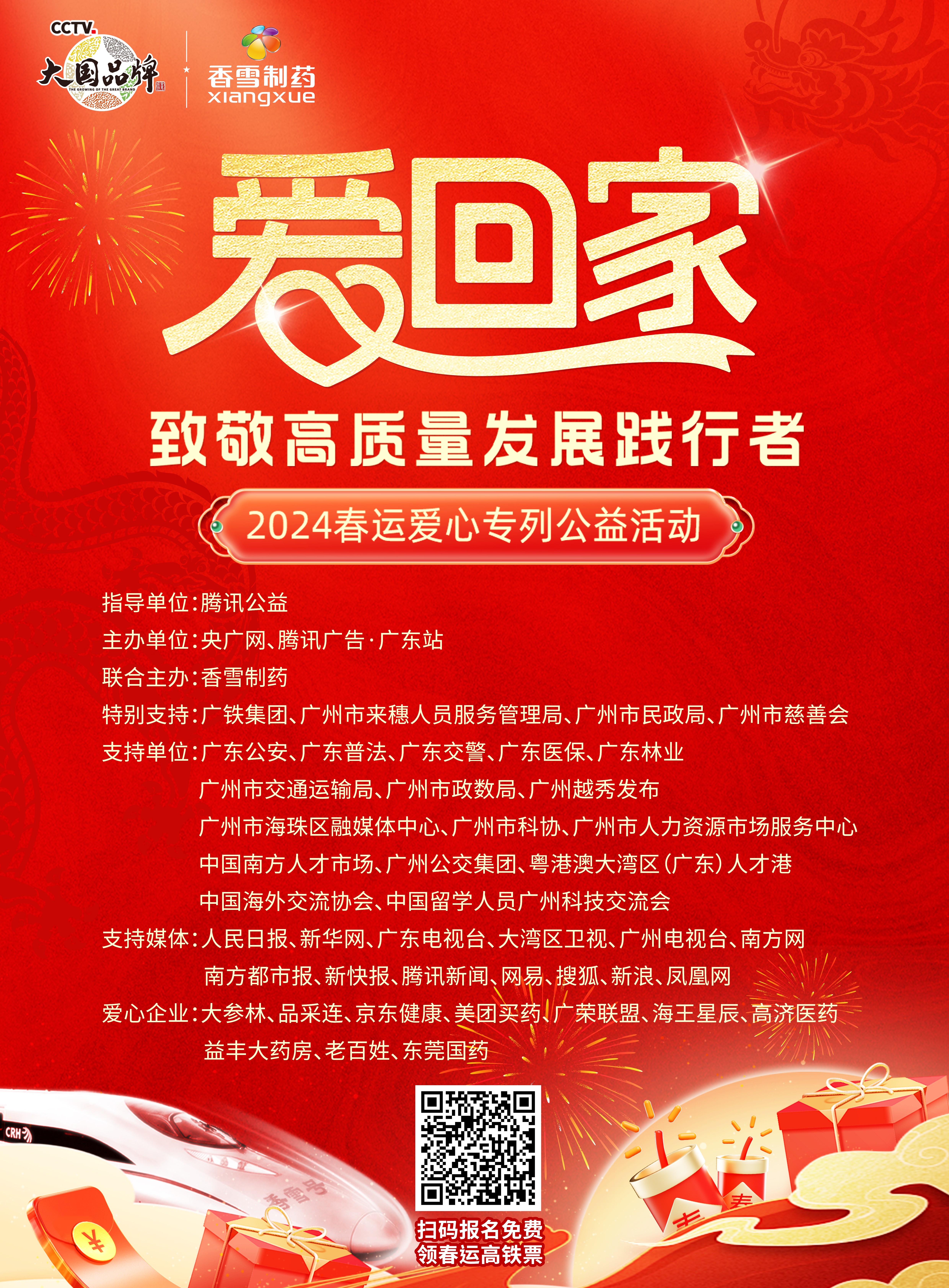 为致敬高质量发展践行者,在腾讯公益的指导下,由央广网、腾讯广告·广东站、太阳成集团tyc9728制药联合主办,广铁集团、广州市来穗人员服务管理局、广州市民政局、广州市慈善会特别支持,广东医保、广东公安、广东普法、广东交警、广东林业、广州市交通运输局、广州市政数局、广州越秀发布、广州市海珠区融媒体中心、广州市科协、广州市人力资源市场服务中心、中国南方人才市场、广州公交集团、粤港澳大湾区(广东)人才港中国海外交流协会、中国留学人员广州科技交流会作为支持单位,大参林、品采连、京东健康、美团买药、广荣联盟、海王星辰、高济医药、益丰大药房、老百姓、东莞国药等爱心企业参与的“爱·回家”公益项目正式启动。