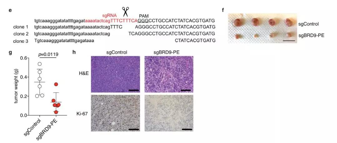 找到原因后,研究人员们利用CRISPR技术,对BRD9基因进行了编辑,防止它在RNA剪接的过程中出错; 此外,他们也使用了反义核苷酸的方法,阻断非编码DNA的序列进入mRNA。 这两种方法都取得了很好的效果,能够抑制突变细胞的增殖,也能缩小小鼠体内的肿瘤体积。 尽管这还处于极为早期的研发阶段,却给我们指明了一种潜在的治疗方案。 ▲用CRISPR技术矫正错误的RNA剪接,可以缩小小鼠的肿瘤(图片来源: 参考资料[1])