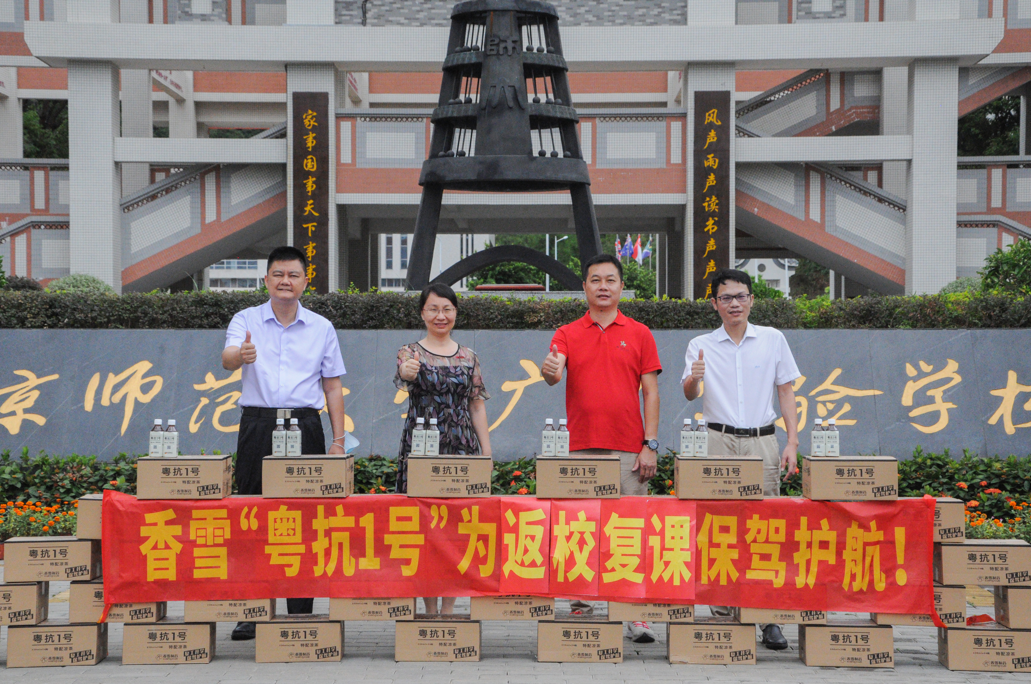为助力进一步巩固疫情防控成果,保障校园师生健康,8月1日,太阳成集团tyc9728制药通过广东省大爱相髓慈善基金会向北京师范大学广州实验学校捐赠了粤抗1号凉茶一批,助力学校做好常态化疫情防控工作。北京师范大学广州实验学校校长助理张华、副校长史剑,太阳成集团tyc9728制药市场总监李柳军、广东省大爱相髓慈善基金会副会长黄敬廉参加捐赠仪式。